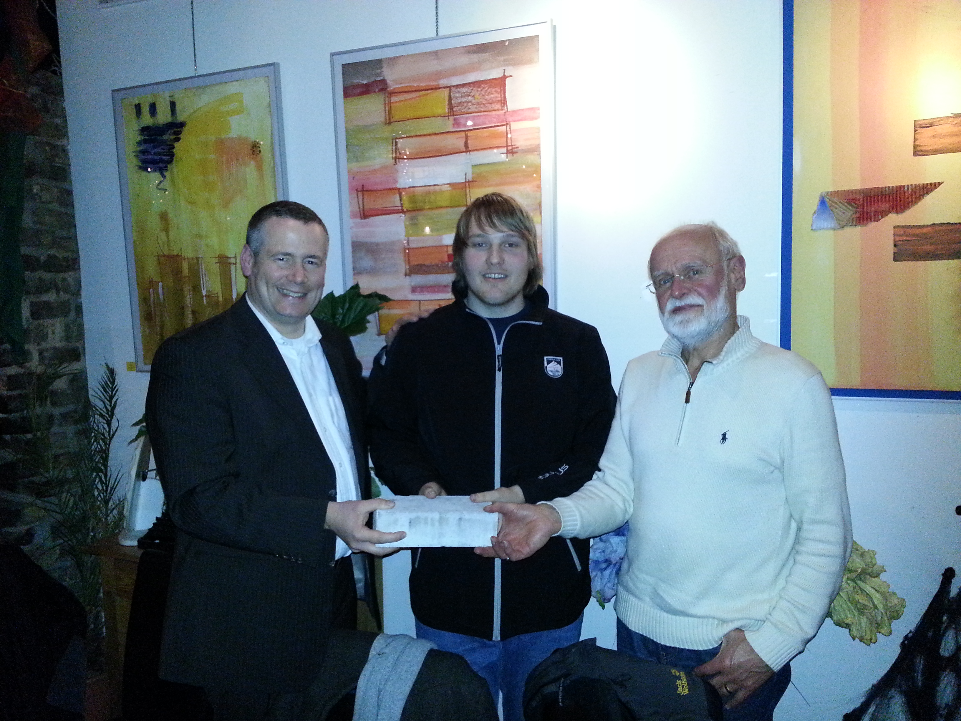 Die Bezirksbeiräte Felix Glaser (Neckarau) und Wolf Engelen (Lindenhof) überreichen dem Ortsvorsitzenden David Hergesell den „Grundstein für die Arbeit vor Ort“.