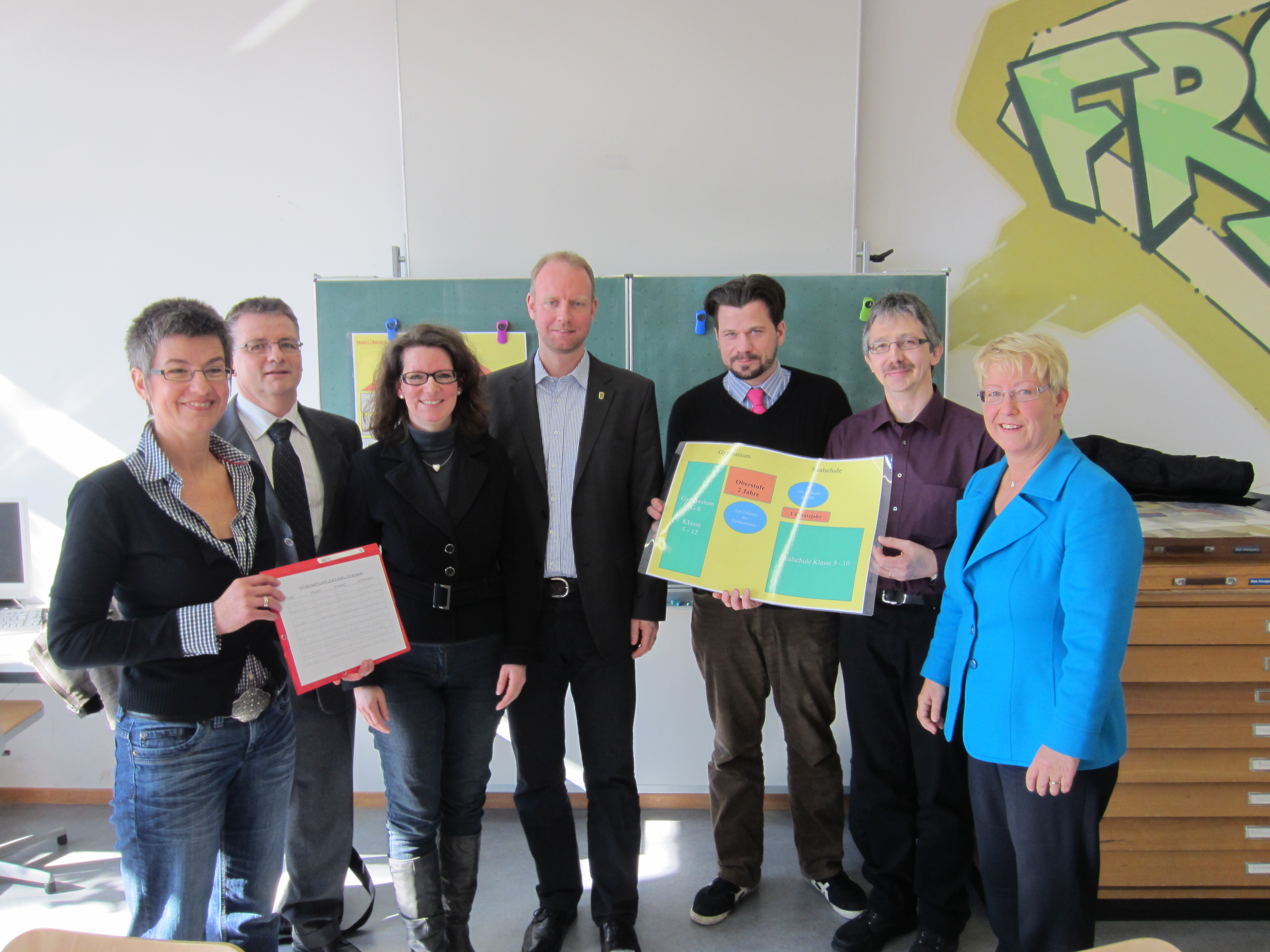 Gemeinsam für den Schulversuch: Susanne Banschbach, Stellv. Vorsitzende der Elternvertretung, Schulleiter Stefan Köhler, Stadträtin Brigit Sandner-Schmitt, Dr. Timm Kern MdL, Fraktionsvorsitzender Volker Beisel, Uwe Bischer, Vorsitzender der Elternvertretung und Stadträtin Dr. Birgit Reinemund MdB (v.l.n.r.)